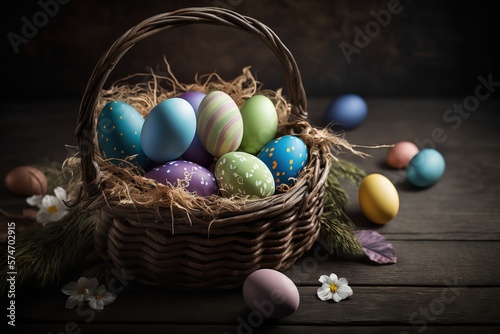 © Rarity Asset Club, Obraz premium Happy easter, Easter painted eggs in the basket on wooden rustic table for your decoration in holiday. copy space