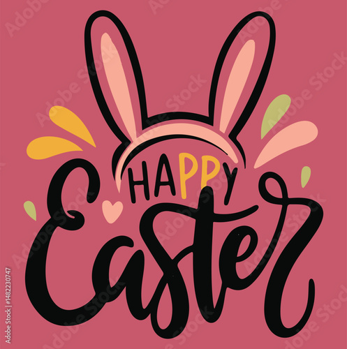 © vectorzking, Obraz premium happy easter handwritten typography vector with bunny ear
