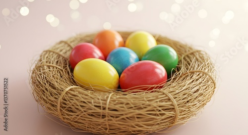 Fototapeta premium "Happy Easter Nest: Colorful Eggs in a Straw Basket"