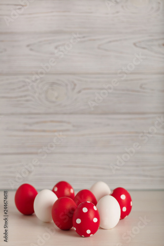 © COLOR PHOTO, Obraz premium Happy Easter! Painted Easter eggs - red, white and red with white polka dots on a gray wooden background.