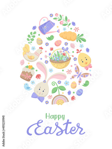 Fototapeta premium Happy Easter postcard. Set of cute holiday elements on white background....