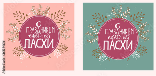 © Elena, Naklejka premium Happy Easter type greeting cards in the floral wreath in boho style. Russian translation: Happy Easter Day! Religious holiday vector illustration for greeting card in boho style. Template