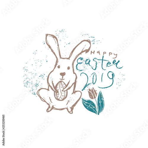 © difinbeker, Obraz premium Happy Easter 2019. Vector illustration imitating pencil drawing. Easter bunny, inscription and easter egg.