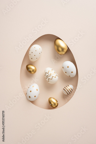 © ActionGP, Fototapeta premium Happy Easter vertical celebration greeting featuring gold and white decorated eggs arranged in a pastel paper cutout for a festive spring holiday visual