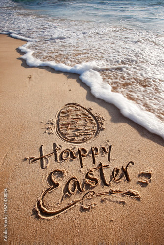 Fototapeta premium Happy Easter Written in Golden Sand with Minimalist Easter Egg Drawing and Wave Foam – Vertical Layout with Copy Space