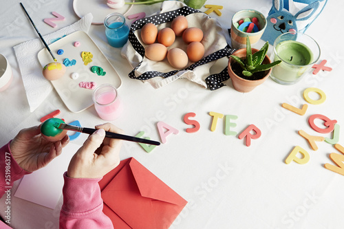 © KleverLevel, Fototapeta premium Happy easter. Young woman painting easter eggs. Happy family preparing for Easter.