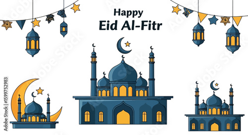 Naklejka premium Happy Eid Al-Fitr Celebration Illustration with Mosques and Lanterns