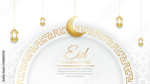 Naklejka premium Happy Eid Islamic social media post with white and gold and lantern ornament pattern background