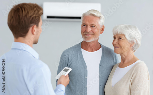 © Jirawatfoto, Obraz premium Happy elderly couple with technician demonstrating remote control for new ductless air conditioner. senior man and woman feel satisfied with home service