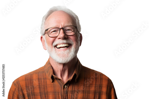 © Natthaporn, Fototapeta premium Happy elderly man laughing and looking at camera Isolated on white background.