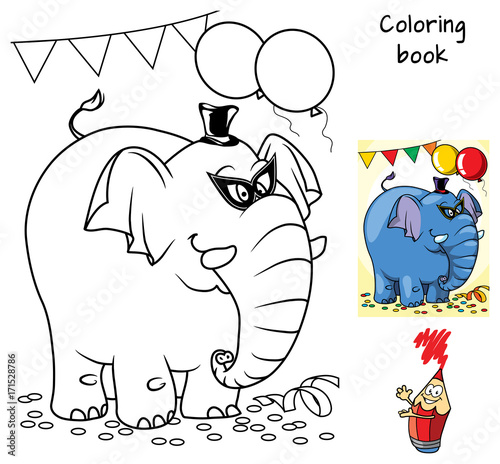 © Leh, Obraz premium Happy elephant at masquerade with mask and hat. Coloring book. Cartoon vector illustration