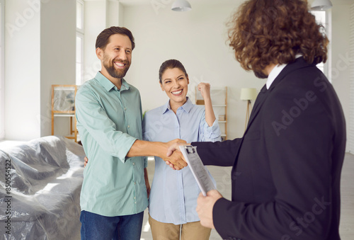 Obraz premium Happy excited smiling young couple customers shaking hands with professional realtor standing in their new flat. Successful family ready to become homeowners. Real estate market concept.