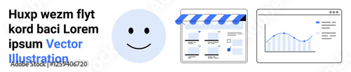 Fototapeta premium Happy face, storefront banner, analytics dashboard with chart and text. Ideal for e-commerce, analytics, marketing, business planning, customer satisfaction, digital strategies audience engagement