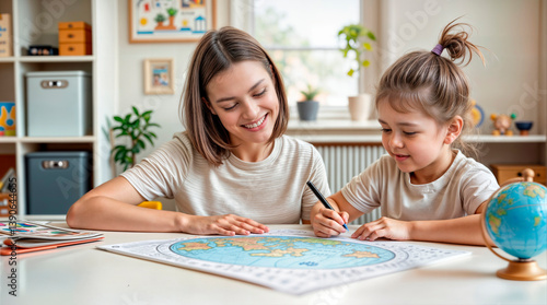 © olvius, Fototapeta premium Happy family. Beautiful little girl and mother drawing a picture of the globe. Earth day, plastic free and zero waste concept.