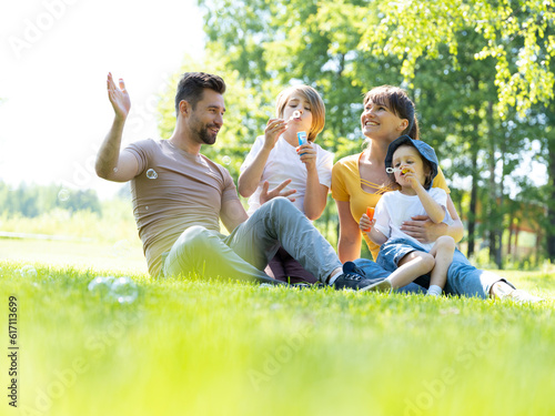 © alotofpeople, Fototapeta premium Happy family blowing soap bubbles