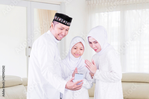 Fototapeta premium Happy family congratulate gesture Eid on cellphone