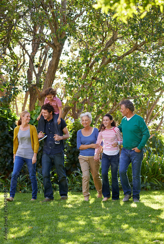© M S/peopleimages.com, Obraz premium Happy family, conversation and together in outdoor nature, love and bonding or relax in backyard. Generations, smile and peace or communication for support in garden or park, vacation and holiday