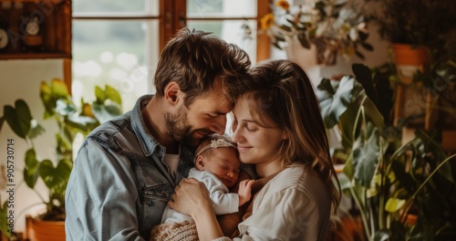 © Karina, Obraz premium Happy Family Embracing Newborn at Home