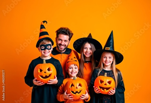 Fototapeta premium Happy family, father, mother and children in costumes and makeup of Halloween...