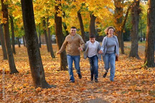 © soleg, Obraz premium Happy family having holiday in autumn city park. Children and parents running, smiling, playing and having fun. Bright yellow trees and leaves