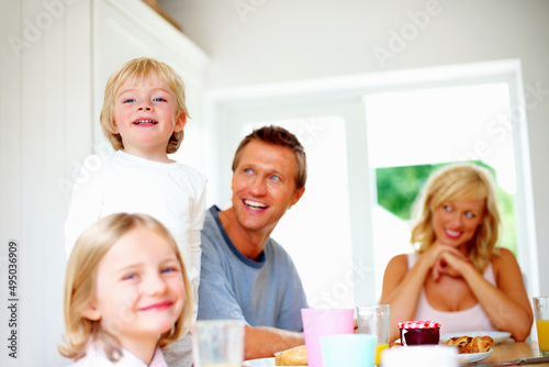 Fototapeta premium Happy family having their breakfast together at home. Portrait of a happy...