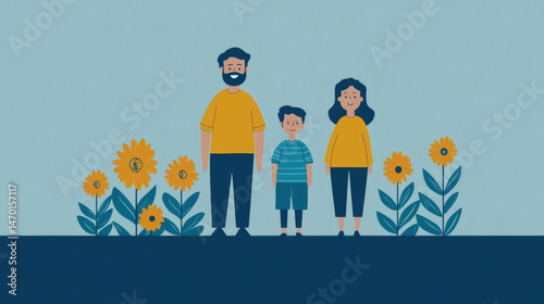 © Mas Labardo, Fototapeta premium Happy family illustration father mother and son with floral elements