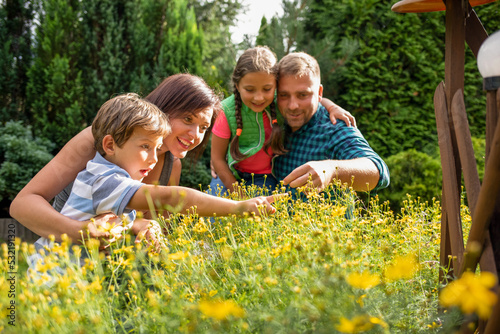 © leszekglasner, Obraz premium Happy family in garden looking at plants on sunny day