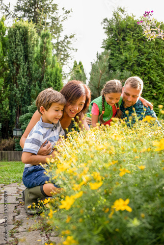 © leszekglasner, Fototapeta premium Happy family in garden looking at plants on sunny day