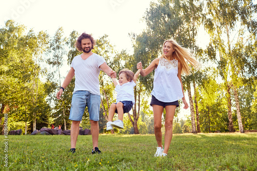 Fototapeta premium Happy family in the park. Parents with a child play in nature.