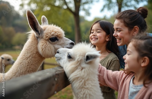 Obraz premium Happy family interacting with alpacas at a zoo. Mother and two daughters...