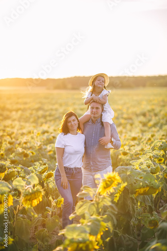 © Irina84, Fototapeta premium Happy family is playing, having fun on the field with sunflowers at sunset.
