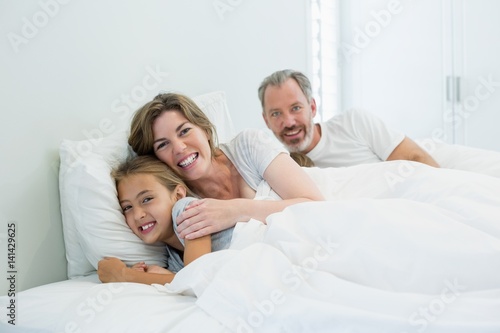 Fototapeta premium Happy family lying on bed in bedroom at home