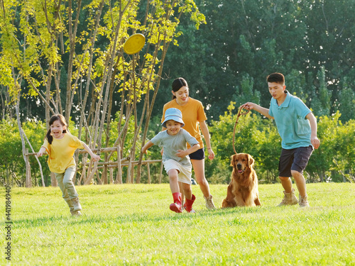 © eastfenceimage, Obraz premium Happy family of four and pet dog playing in the park
