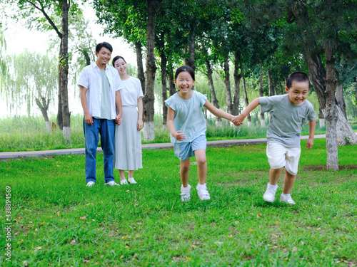 © eastfenceimage, Obraz premium Happy family of four playing in the park