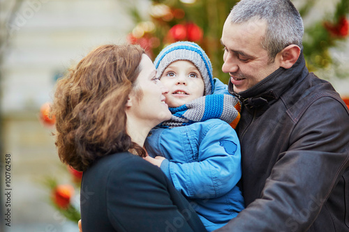 © Ekaterina Pokrovsky, Fototapeta premium Happy family of three walking together in Paris
