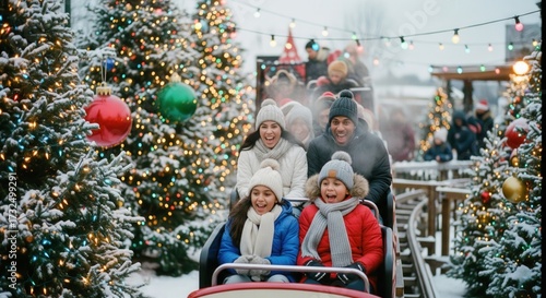 © Chattraporn, Naklejka premium Happy family on a roller coaster at a winter Christmas market