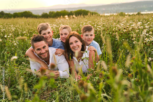 © Louis-Paul Photo, Fototapeta premium Happy family on daisy field at the sunset having great time together