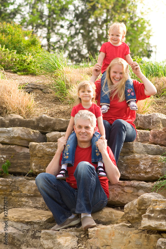 © bandaska, Fototapeta premium Happy family outdoor in red above each other