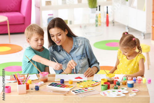 © Africa Studio, Fototapeta premium Happy family painting pictures at table indoors