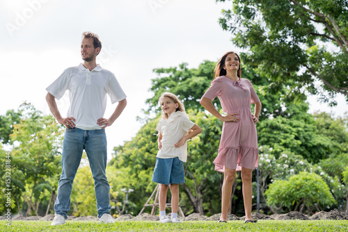 © Nopphon, Obraz premium Happy family parent children having picnic outdoor activity. Enjoy happiness moment summer playing together including father mother son and daughter relaxing in the morning sunrise.