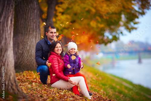 © Olesia Bilkei, Fototapeta premium happy family playing among fallen leaves in autumn park