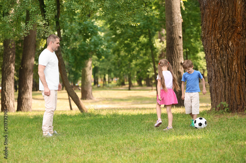 © Pixel-Shot, Obraz premium Happy family playing football in park on summer day