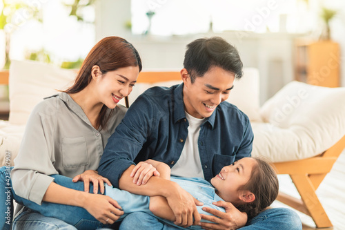 © Tom Wang, Obraz premium Happy family playing on the couch at home