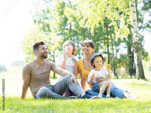 Fototapeta premium Happy family playing with soap bubbles