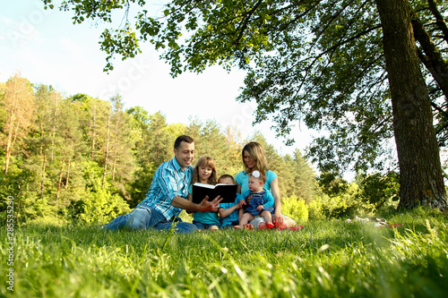 © Kostia, Fototapeta premium happy family reading the Bible in nature