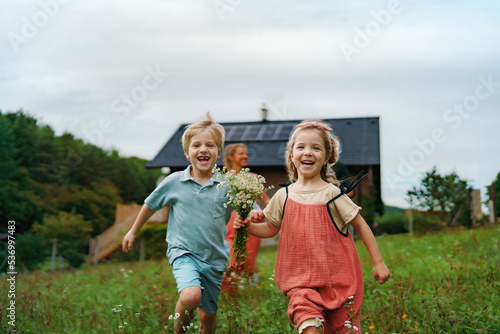 Obraz premium Happy family running near their house with solar panels. Alternative energy,...