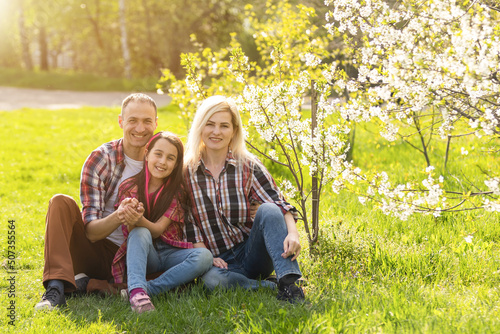 © Angelov, Fototapeta premium Happy family spending good time together in spring in a flowering garden