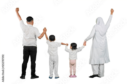 Naklejka premium Happy Family Standing Together with Raised Hands