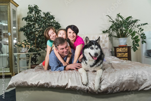 © Валентина Баранова, Obraz premium Happy family together with a dog lie on a large bed indoors.