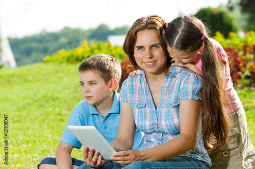 © tcsaba, Fototapeta premium Happy Family using laptop lying on grass